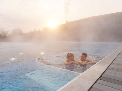 Uwaga: Całkowicie zmodernizowana strefa kąpielowa ma być ponownie dostępna dla gości od października 2024 roku. Już teraz można korzystać z całego świata saun, w tym nowego domku wypoczynkowego z saunami, multimedialnego świata solanki, podgrzewanego basenu zewnętrznego, oazy wellness z atrakcyjną ofertą masaży i całej strefy terapeutycznej.