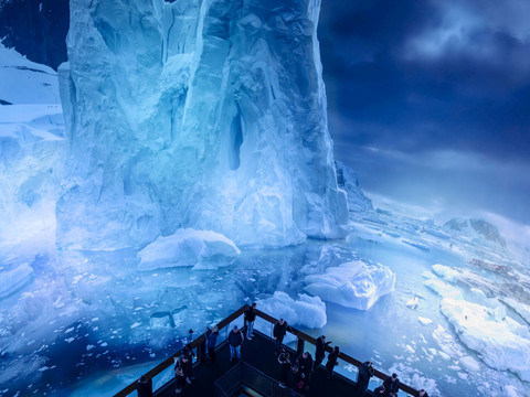 stretch out in a reduced, almost surreal color palette. The depiction plays with the waterline as a central perspective - enormous ice formations rise up above the surface, while the hidden life of the Antarctic becomes visible under water. The 32-metre-high panoramic view can be experienced from a platform that appears to be on the water in front of the Antarctic ice sheet - a view of a world that is otherwise reserved for only a few researchers.